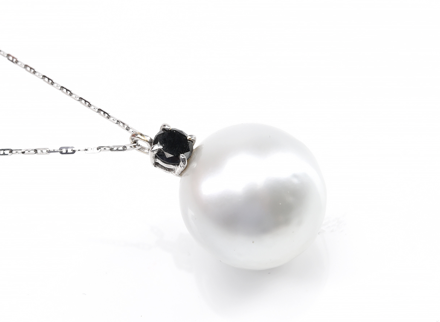 A SOUTH SEA PEARL AND BLACK DIAMOND PENDANT, THE ROUND PEARL OF SILVER WHITE HUE MEASURING 16.9MM, TO A BLACK ROUND BRILLIANT CUT DIAMOND SET BALE IN 18CT WHITE GOLD, SUSPENDED FROM A CONFORMING FINE LINK CHAIN