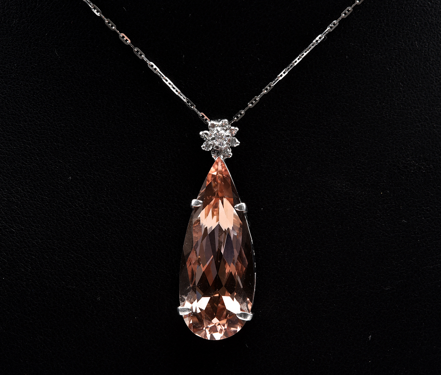 A MORGANITE AND DIAMOND PENDANT, THE PEAR CUT MORGANITE WEIGHING 12.55CTS TO A DIAMOND CLUSTER BALE, IN 18CT WHITE GOLD