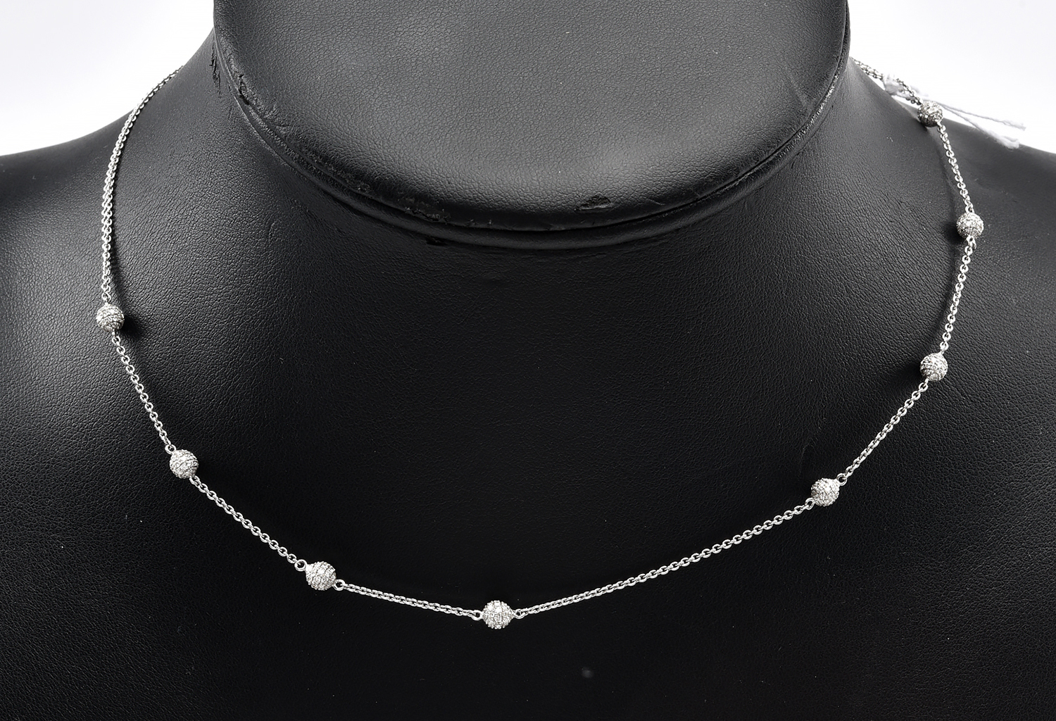 A DIAMOND NECKLACE COMPRISING EIGHT DIAMOND SET SPHERES ON A FINE TRACE CHAIN TOTALLING 1.25CTS, IN 18CT WHITE GOLD