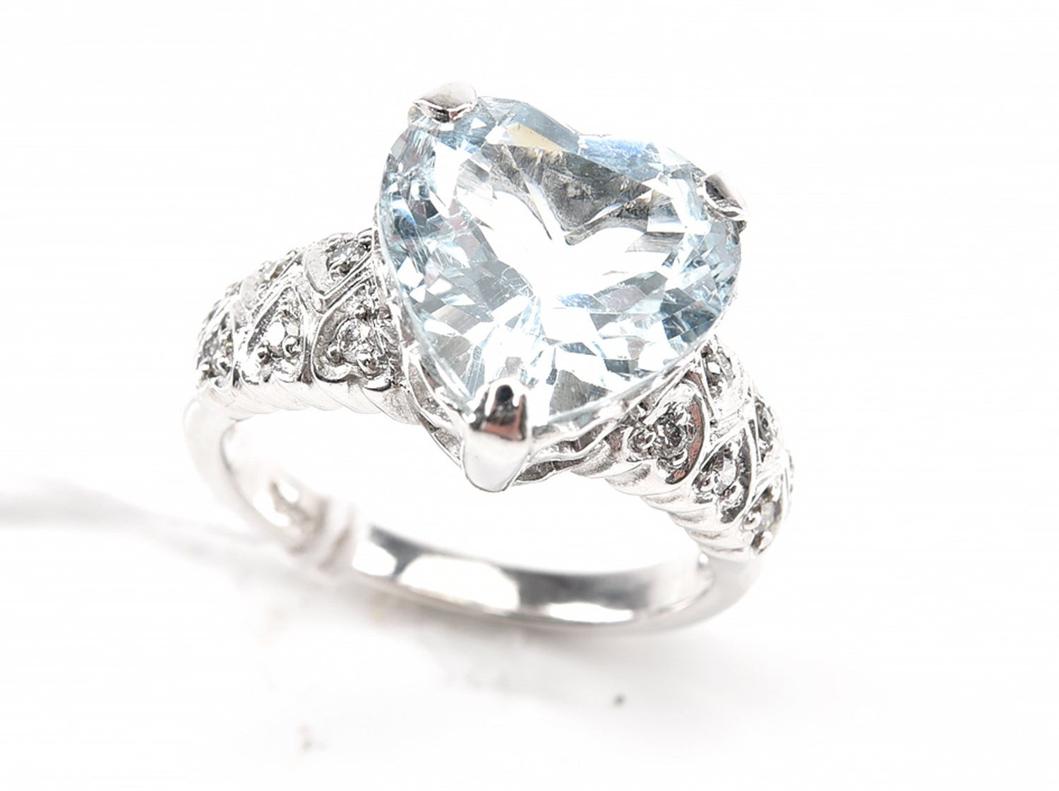 A HEART SHAPED AQUAMARINE AND DIAMOND RING THE AQUAMARINE WEIGHING 4.90CTS, IN 18CT WHITE GOLD RING SIZE J, 5.4GMS