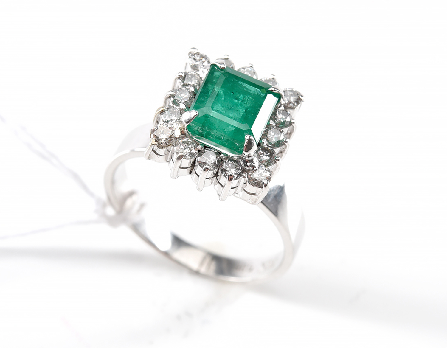 AN EMERALD AND DIAMOND SQUARE CLUSTER RING IN 14CT WHITE GOLD, SIZE K, 4.8GMS