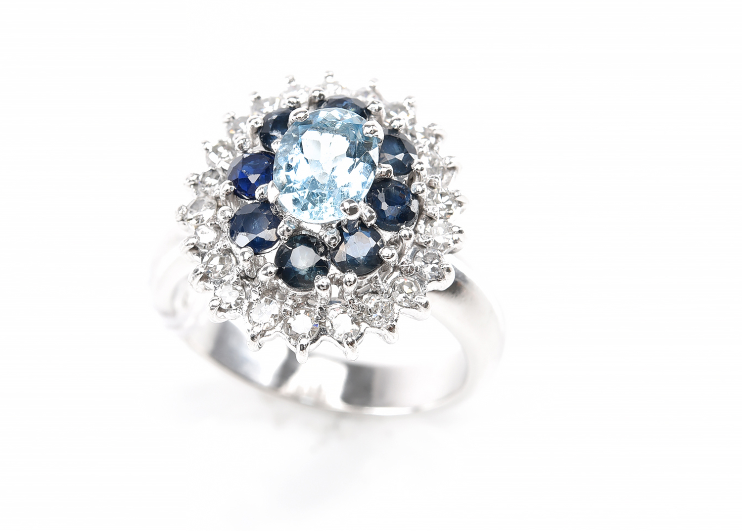 AN AQUAMARINE, SAPPHIRE AND DIAMOND CLUSTER RING IN 18CT WHITE GOLD, SIZE P