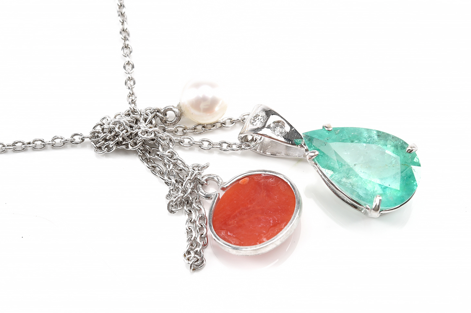 A COLUMBIAN EMERALD AND DIAMOND PENDANT WITH CORAL AND PEARL DETAIL IN 18CT GOLD