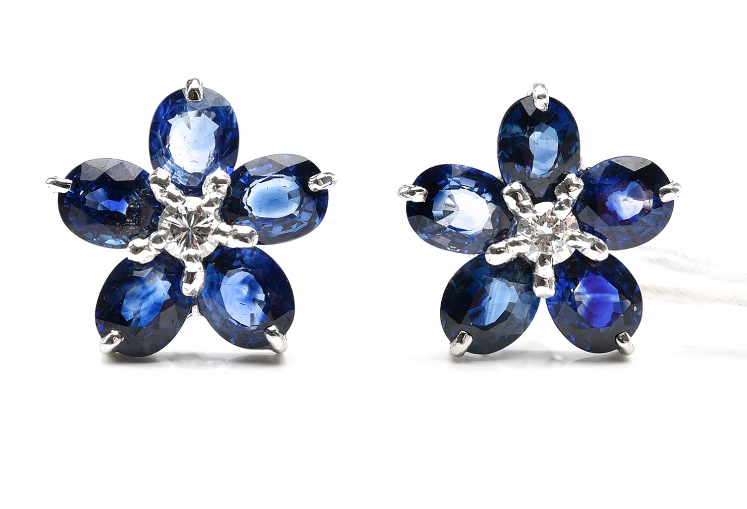 A PAIR OF FLORAL SAPPHIRE AND DIAMOND EARRINGS IN 18CT WHITE GOLD, 4.2GMS
