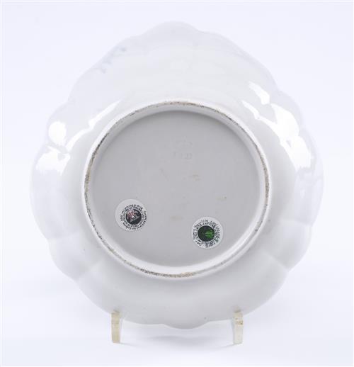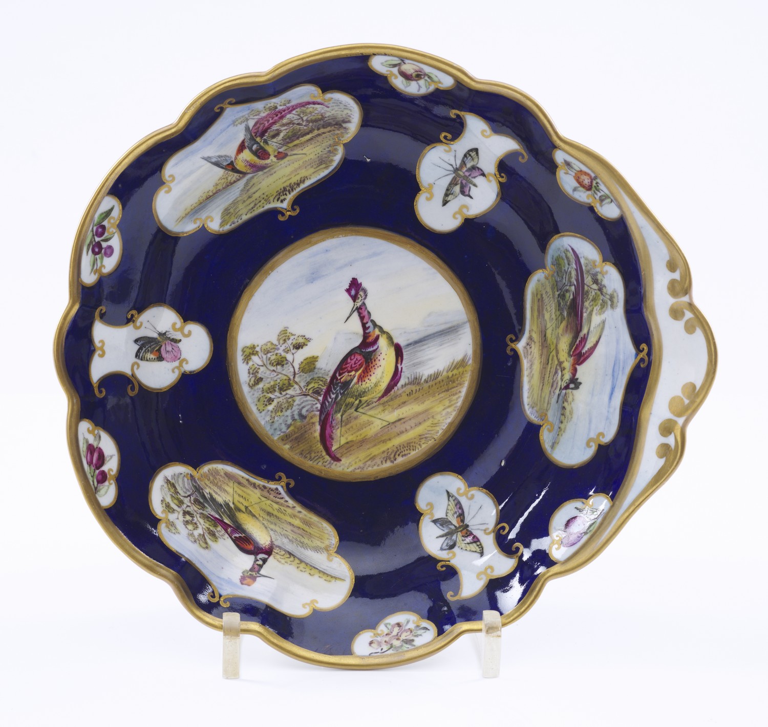 Painted with gilded blue borders and reserves of fancy birds and butterflies. Impressed BFB to base.