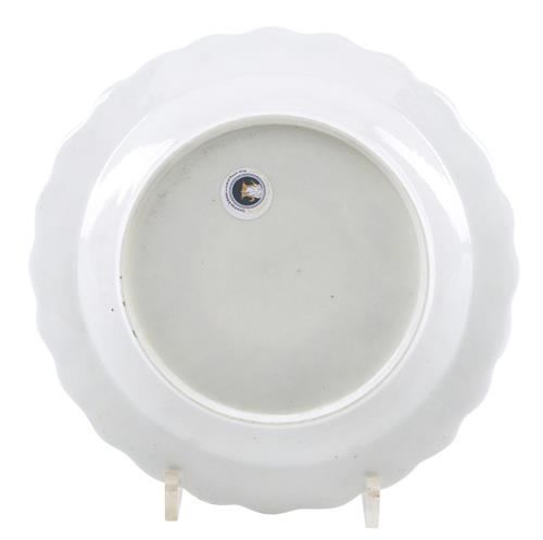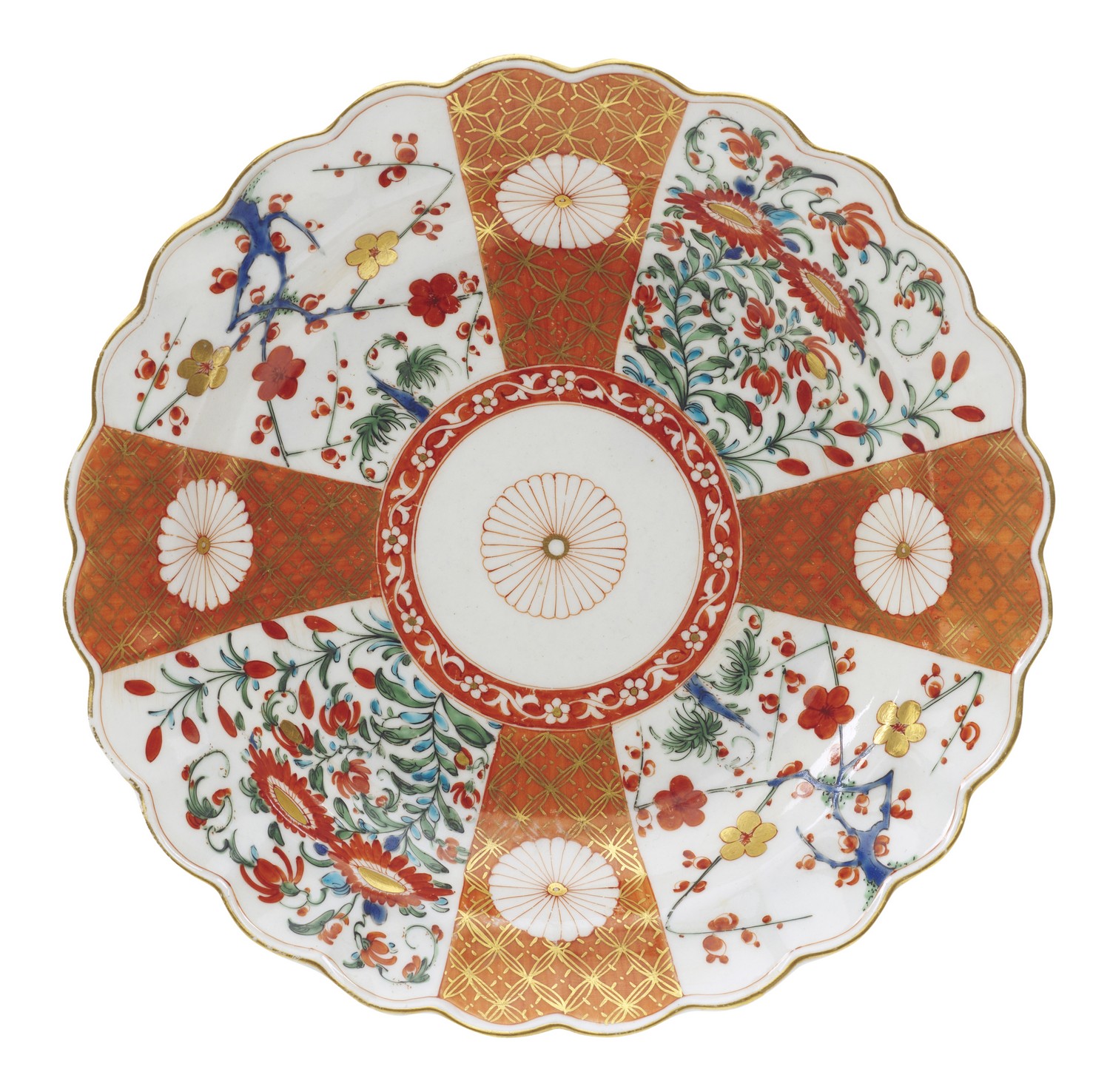 With a scalloped rim, decorated with chrysanthemum plants and branches of prunus blossoms predominately in iron red. No mark to verso.