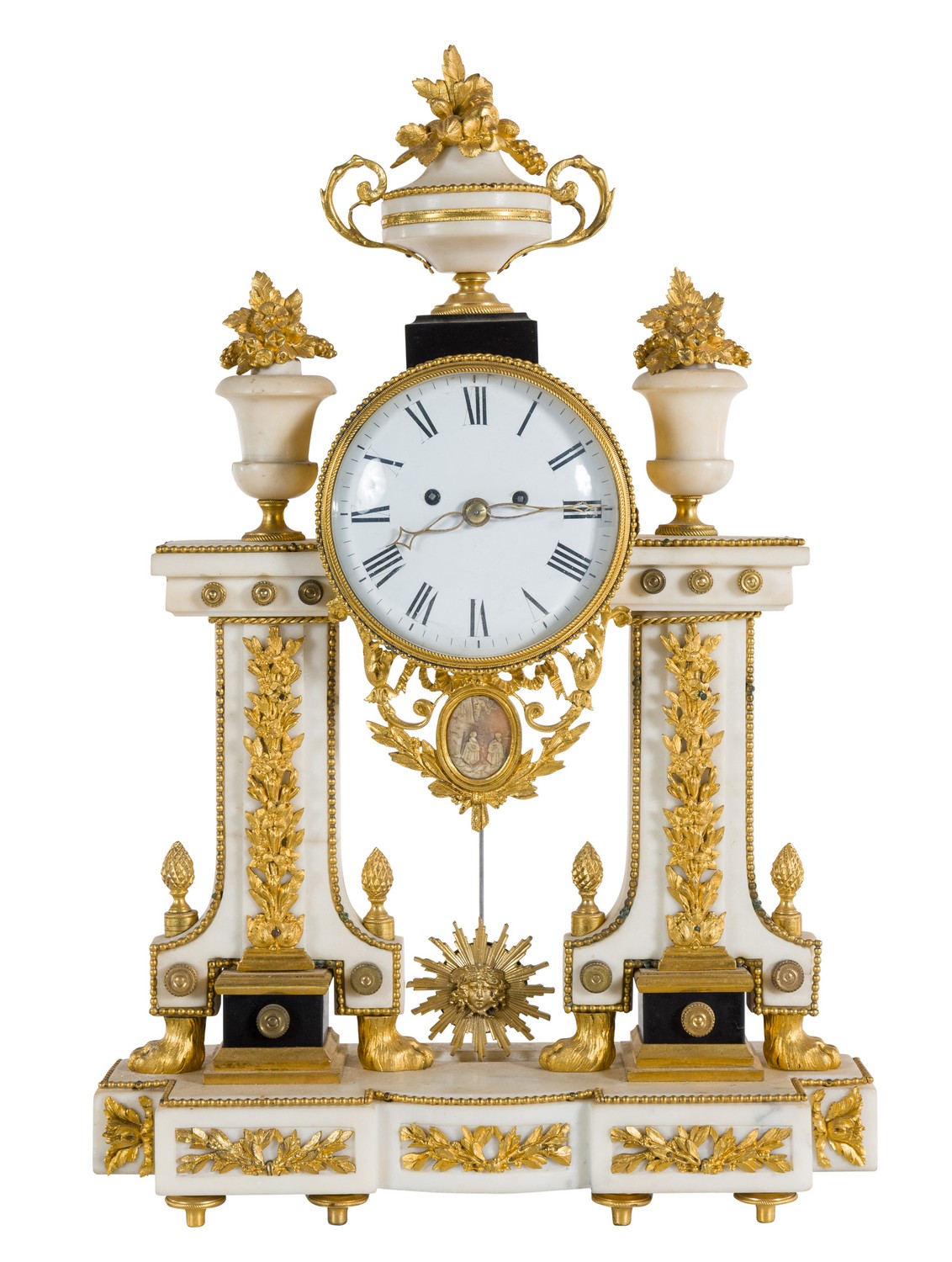 Dial has minor hairline cracks between the numerals 6 & 7 and small chips to dial around key hole. The case with wear and scratching to the drum. Repair to one marble pillar.