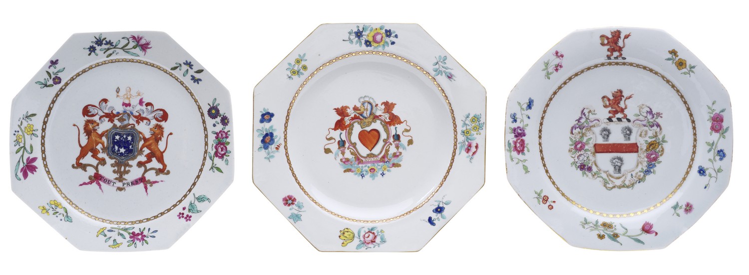 The first being an English replacement for a Chinese export service, decorated with the arms of Murray of Touchdam and Polmaise with the motto ''Tout Prest". Circa 1755. The second with painted flower sprigs to the rim, decorated with the arms of the Douglas family, together with the motto "Spero", circa 1800.
