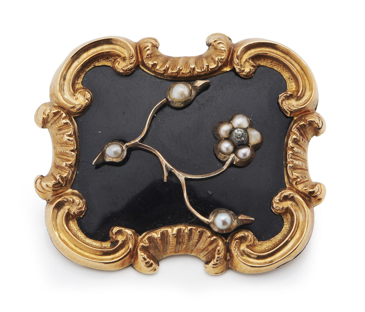 The brooch presents in very good order. Enamel is intact, seed pearls and paste are secure. The hair feature to reverse in good order. Pin is secure. 10.65 grams.