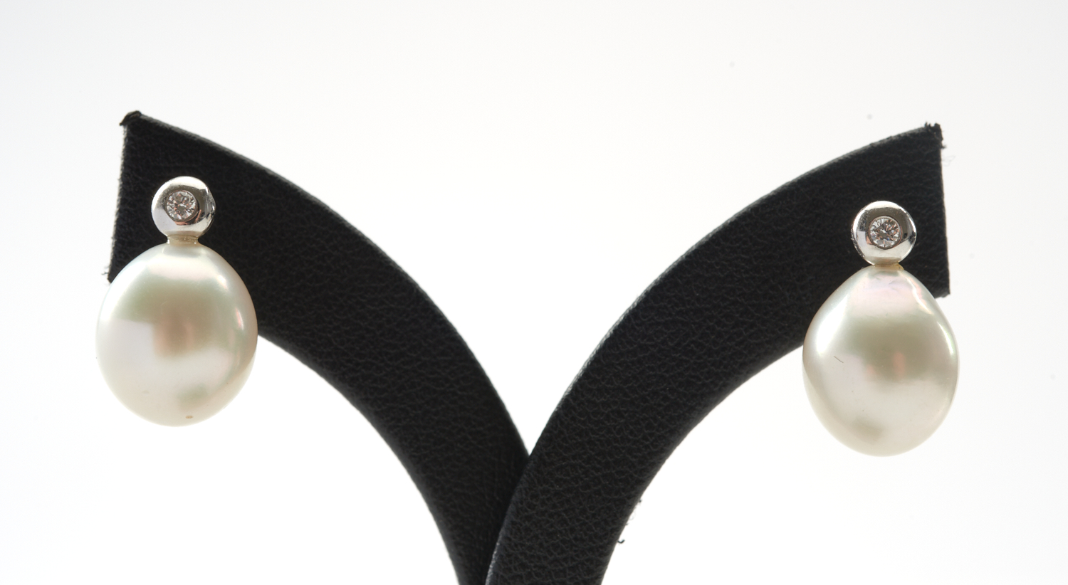 A PAIR OF SOUTH SEA PEARL (10.7x12.5MM) AND DIAMOND EARRINGS IN 18CT WHITE GOLD