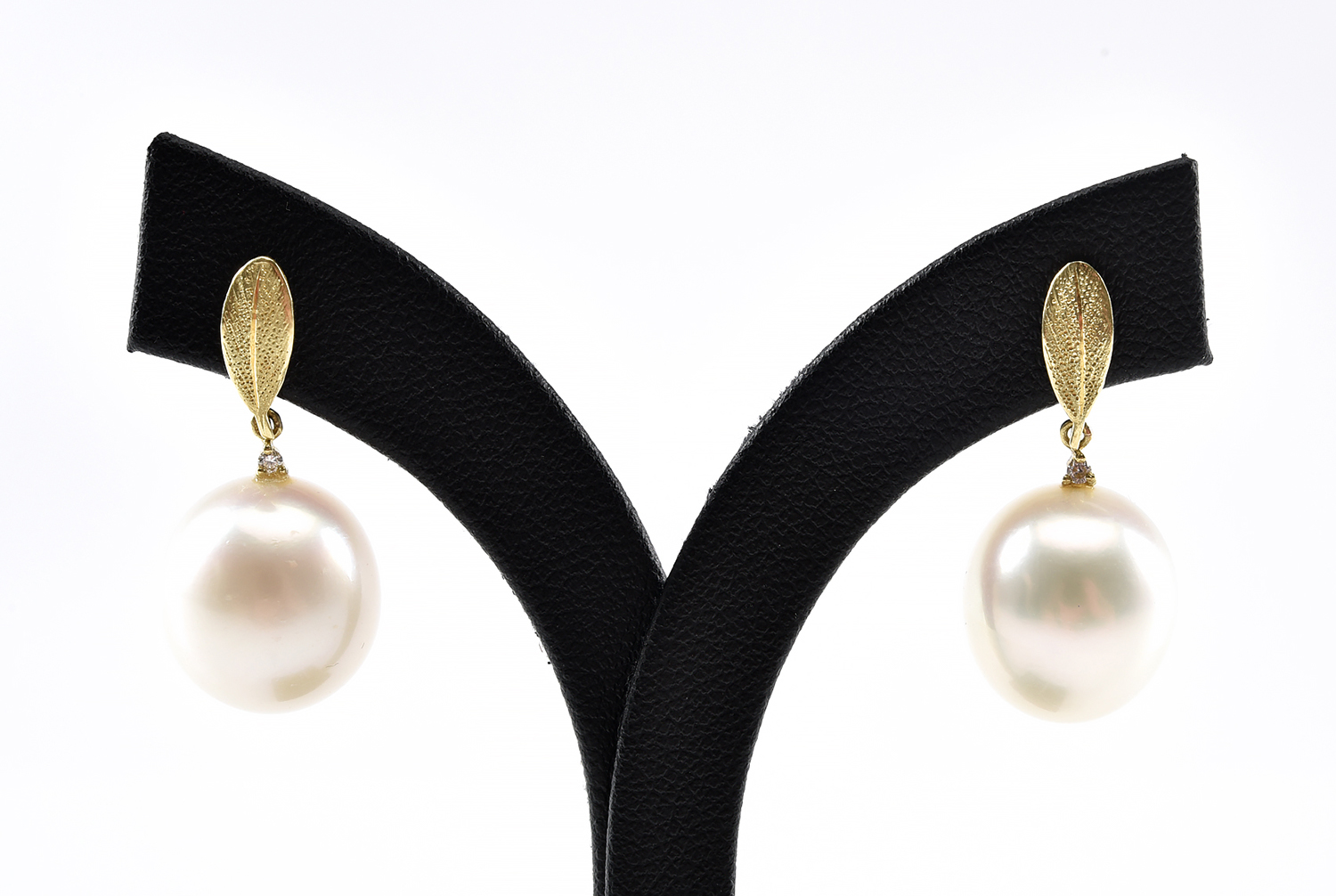 A PAIR OF SOUTH SEA PEARL AND DIAMOND DROP EARRINGS IN 18CT GOLD, PEARLS APPROXIMATELY MEASURE 12.5 x 14MM.