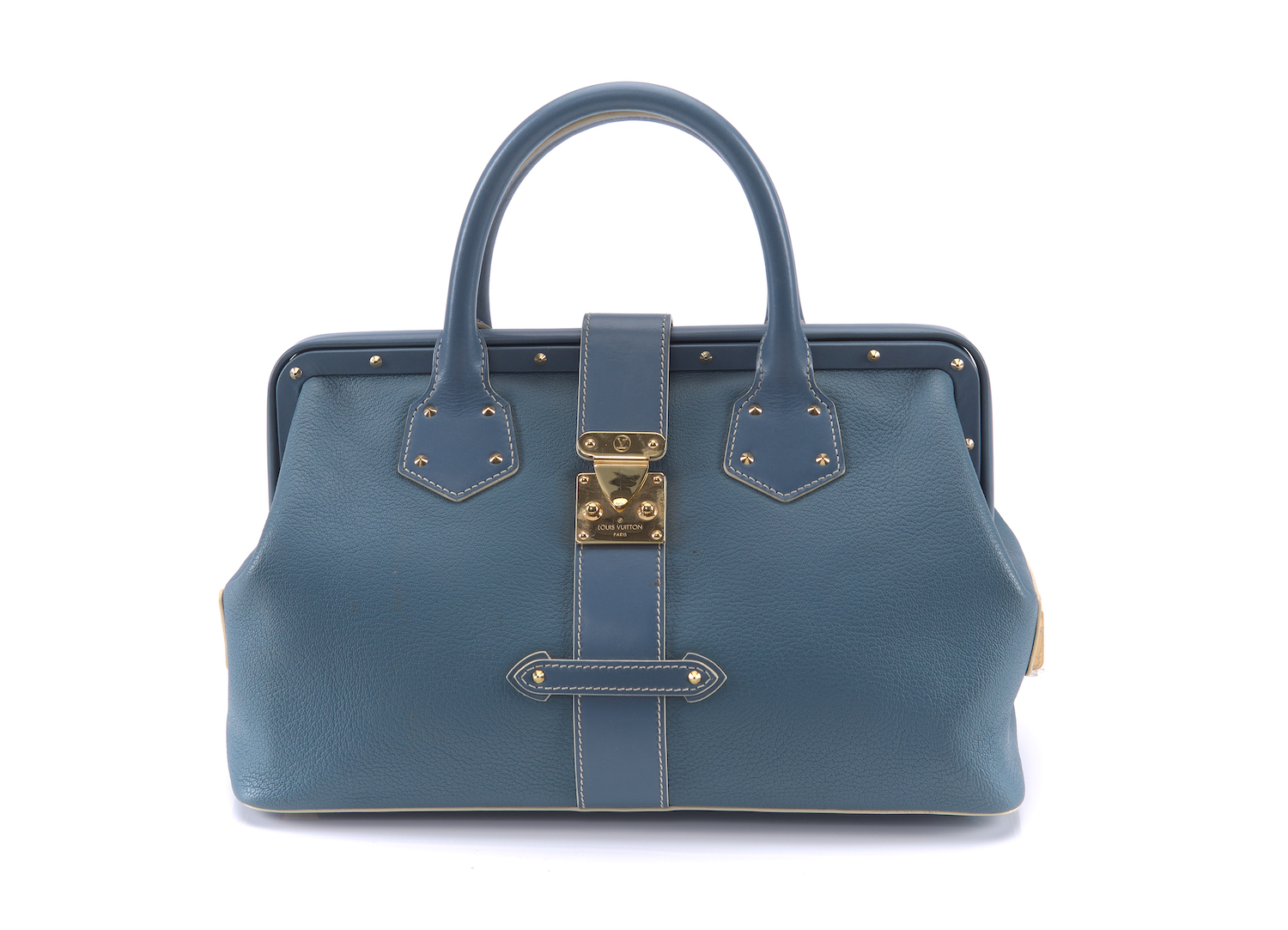 Styled in blue Suhali leather with contrast stitching and gold metal hardware, 20 x 33 x 14cm.