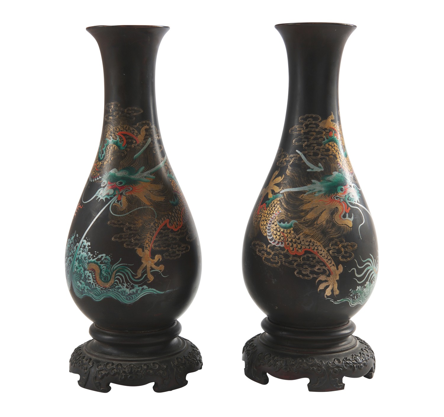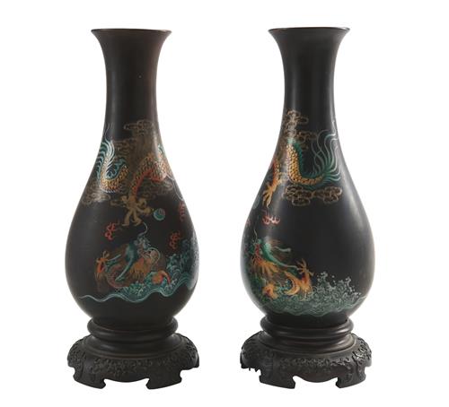 The baluster form vases decorated with dragons chasing a flaming pearl and scrolling lotus, on integral stands.