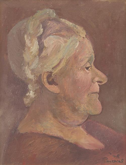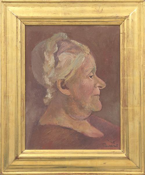 Overall good condition, consistent with age. the work is unlikely untouched therefore there is minor surface dirt throughout. The paint surface appears to show some light blooming. The work is housed in a gilded frame by Brett Lichtenstein (hand written label verso). 46 x 38cm (overall size).