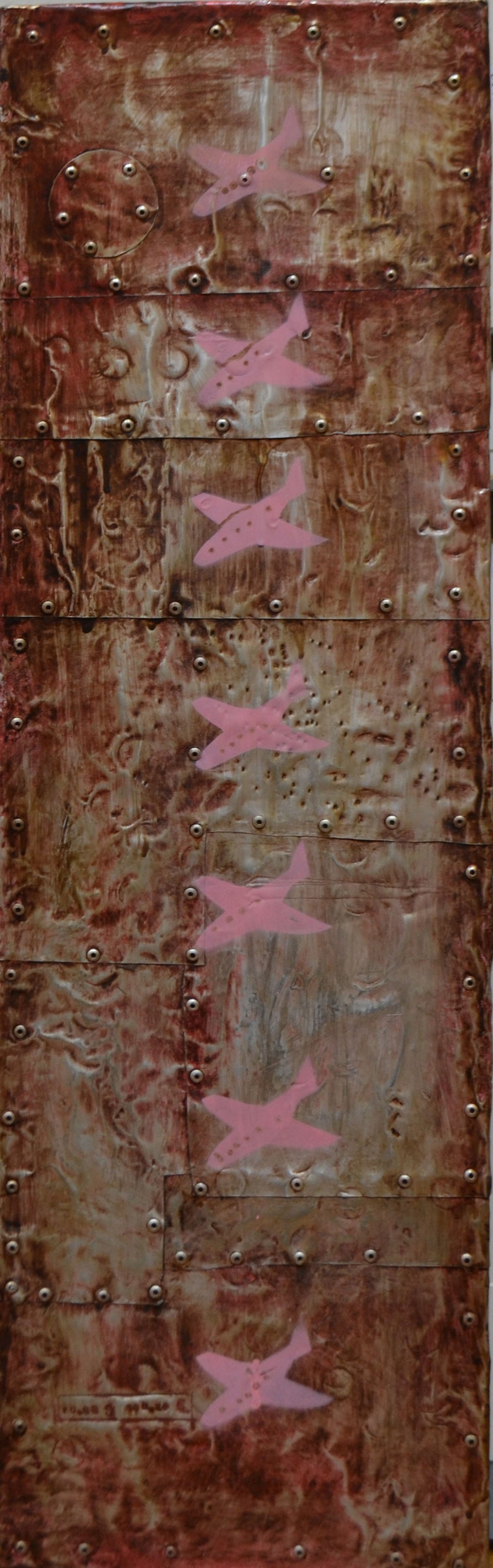 NICHOLAS BURTON, UNTITLED (AEROPLANES), TIN, NAILS AND SYNTHETIC POLYMER PAINT, 97 X 30 CM, UNFRAMED, CONDITION: GOOD