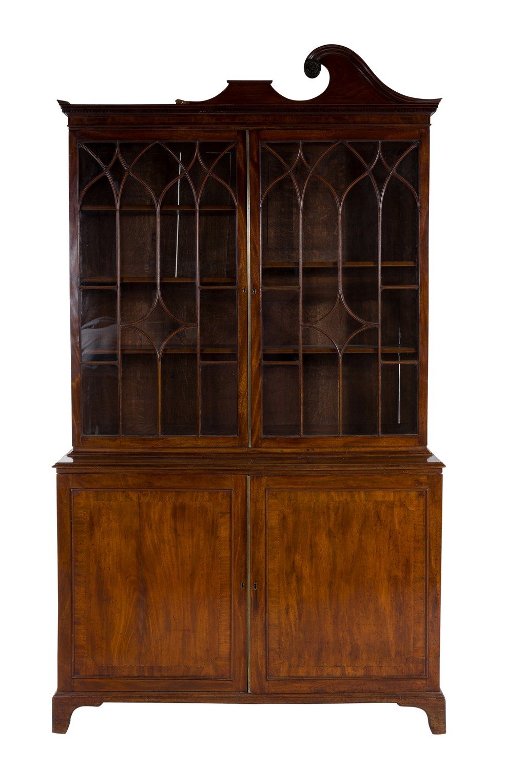 Of generous proportions, the pelmet with flanking scrolls above two astragal glazed doors opening to two sets of shelves, sitting upon a cabinet with two inlaid doors, raised upon bracket feet