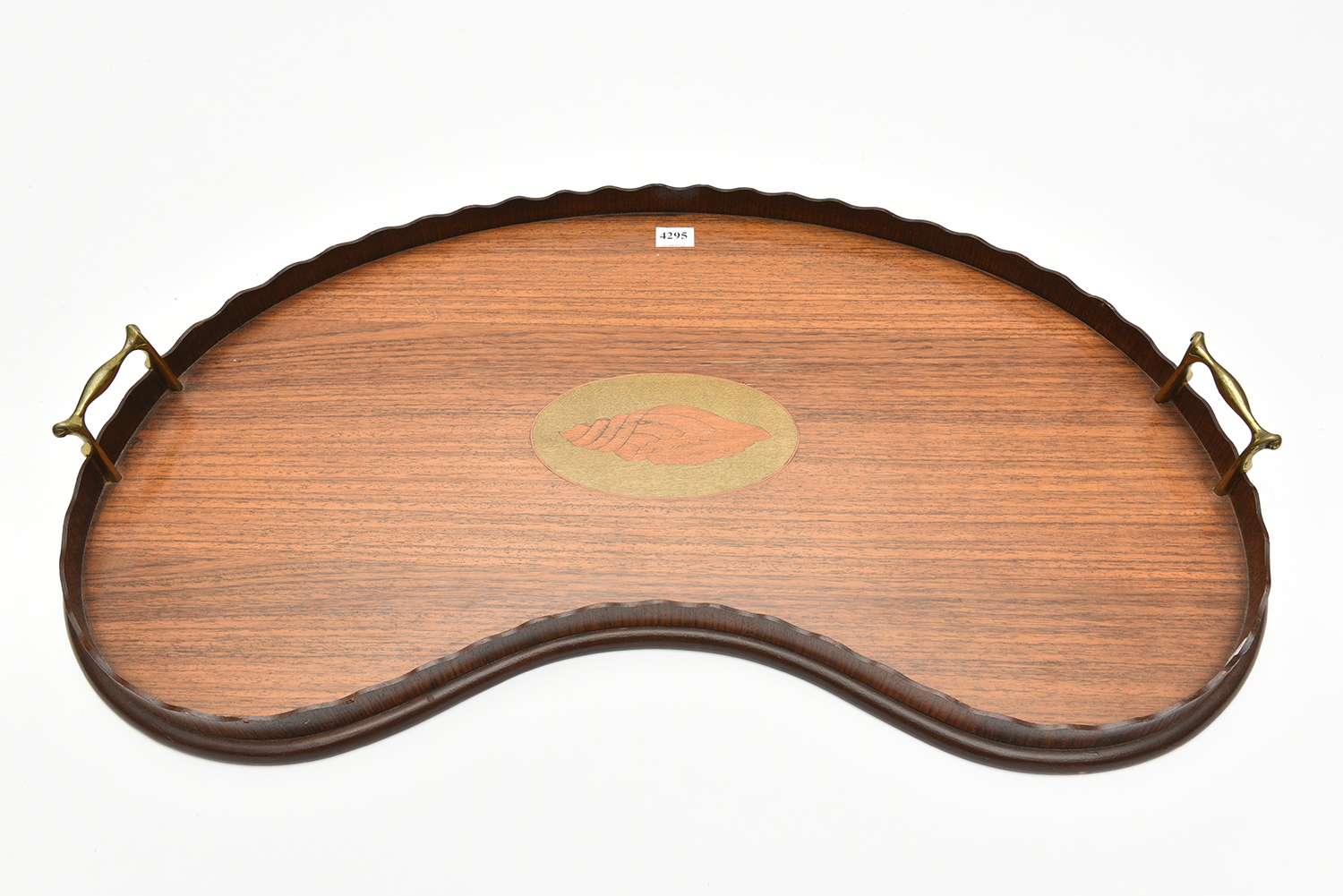 AN EDWARDIAN INLAID ROSEWOOD KIDNEY SHAPED TRAY, 65 CM WIDE