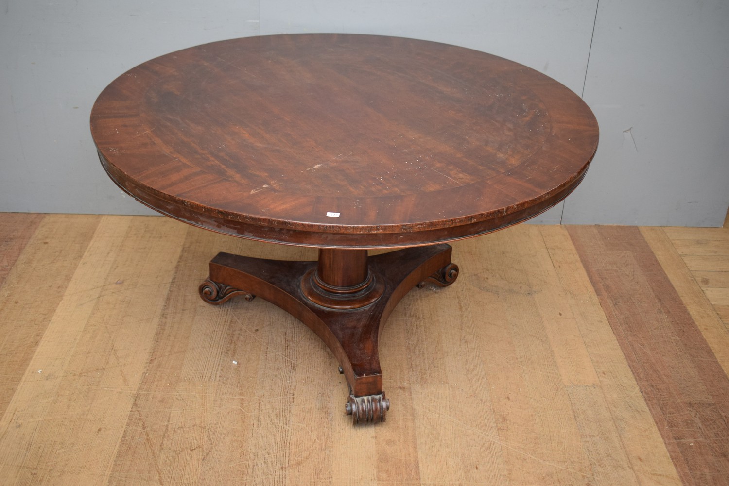 A WILLIAM IV FLAME MAHOGANY FLIP TOP TABLE (A/F, MISSING PINS) (73H X 129D CM)