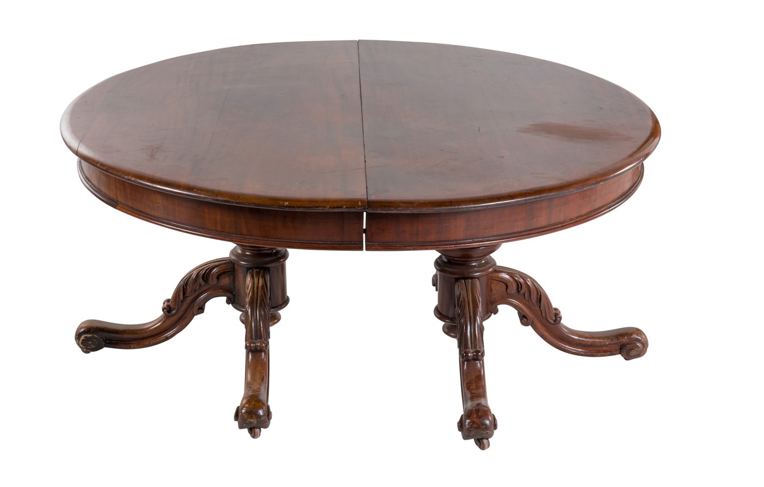 Having 'D' ends, raised upon two tripod leg pedestals with carved acanthus leaf motifs, on castors
