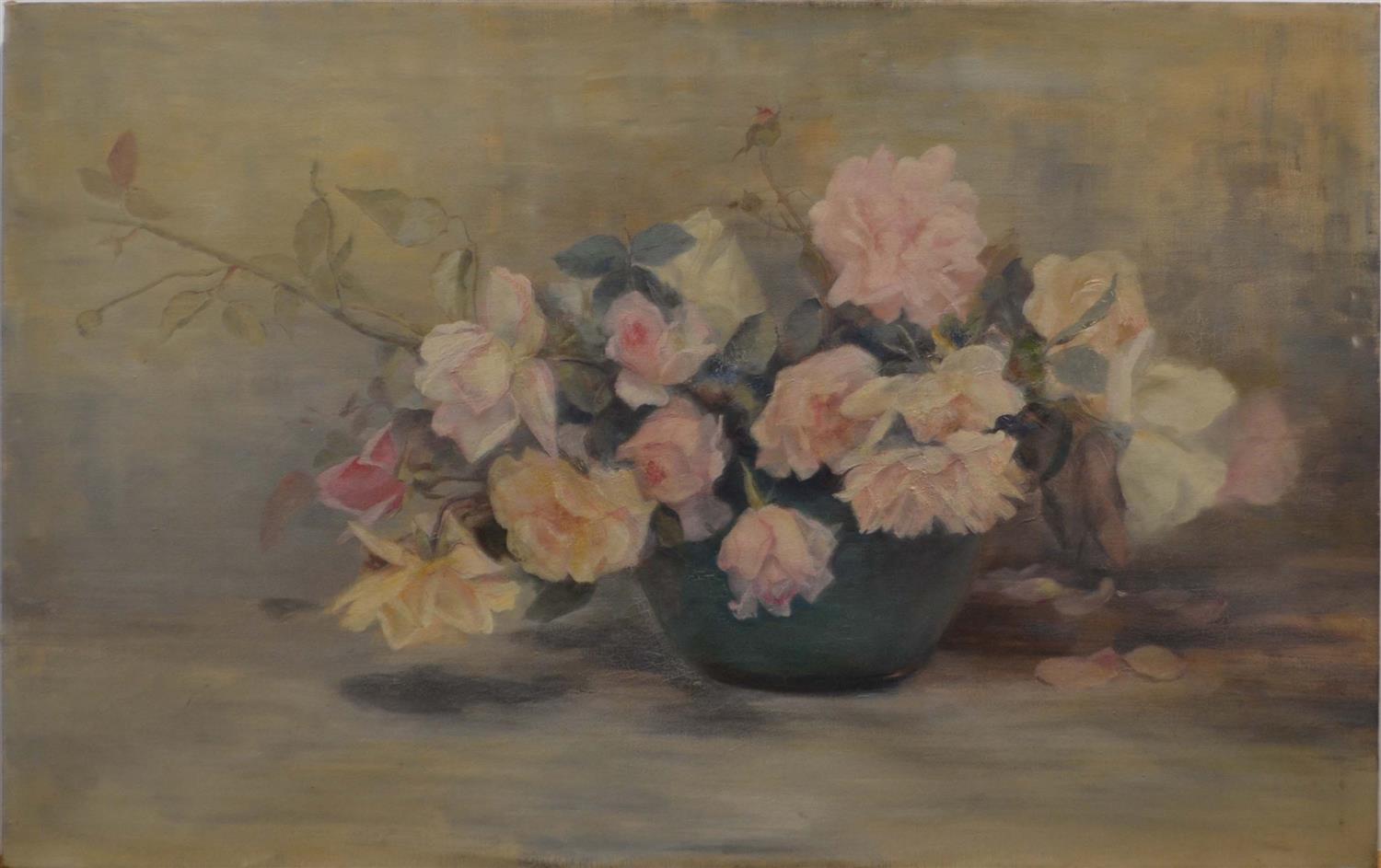ARTIST UNKNOWN, STILL LIFE WITH ROSES, OIL ON CANVAS, 51 X 79CM, STRETCHED WITH NO FRAME, CONDITION: HAIRLINE CRACKING THROUGHOUT, GENERAL DISCOLOURATION, WEAR TO EDGES OF CANVAS, HOLE PUNCTURE IN THE TOP LEFT HAND CORNER, LEONARD JOEL DELIVERY SIZE: SMALL