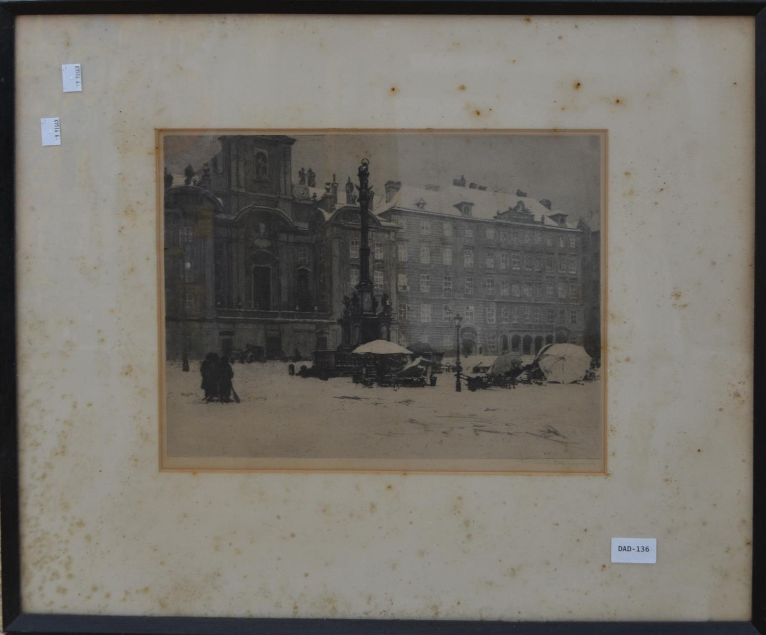 ARTIST UNKNOWN, TOWN SQUARE, ETCHING, 27 X 37CM, FRAMED: 55 X 65.5CM, CONDITION: DISCOLOURATION AND SEVERE FOXING, LEONARD JOEL DELIVERY SIZE: MEDIUM