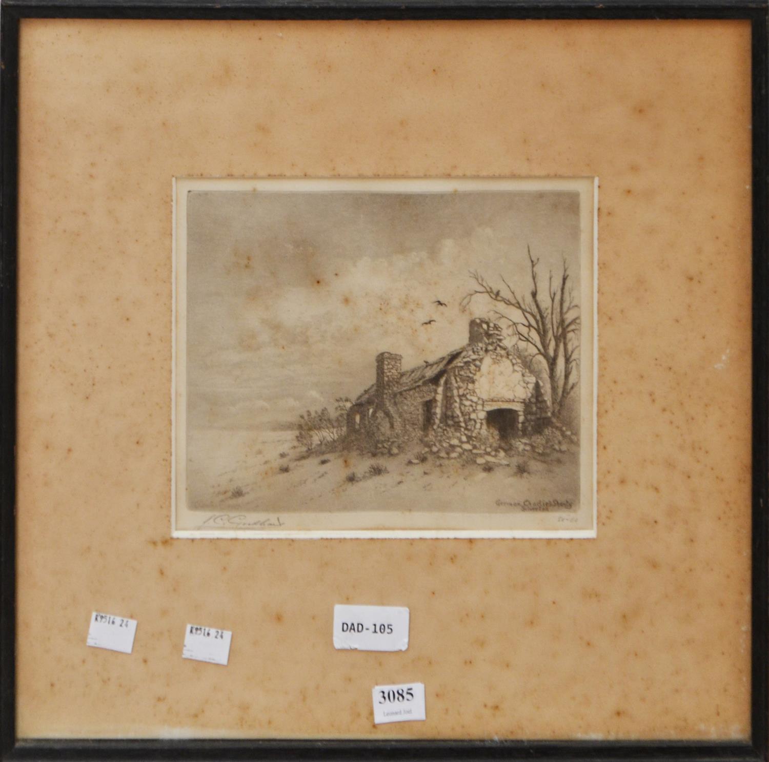 J C GOODHART, GERMAN CHARLIE'S SHANTY, SILVERTON, ETCHING, 16 X 20CM, FRAME SIZE: 37 X 39CM, CONDITION: SEVERE FOXING SEEN THROUGHOUT, NEEDS NEW MOUNT, FRAME