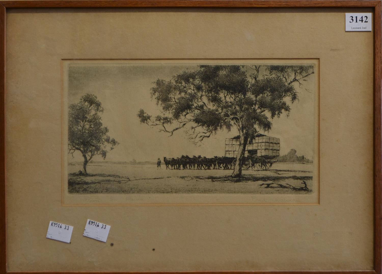 FRED WILLIAMS, ACROSS THE PLAINS, ETCHING, 12 X 23CM, FRAME SIZE: 26.5 X 37CM, CONDITION: MINOR FOXING UPON IMAGE, FOXING TO MOUNT, MOUNT BURN PRESENT, REFRAMING SUGGESTED
