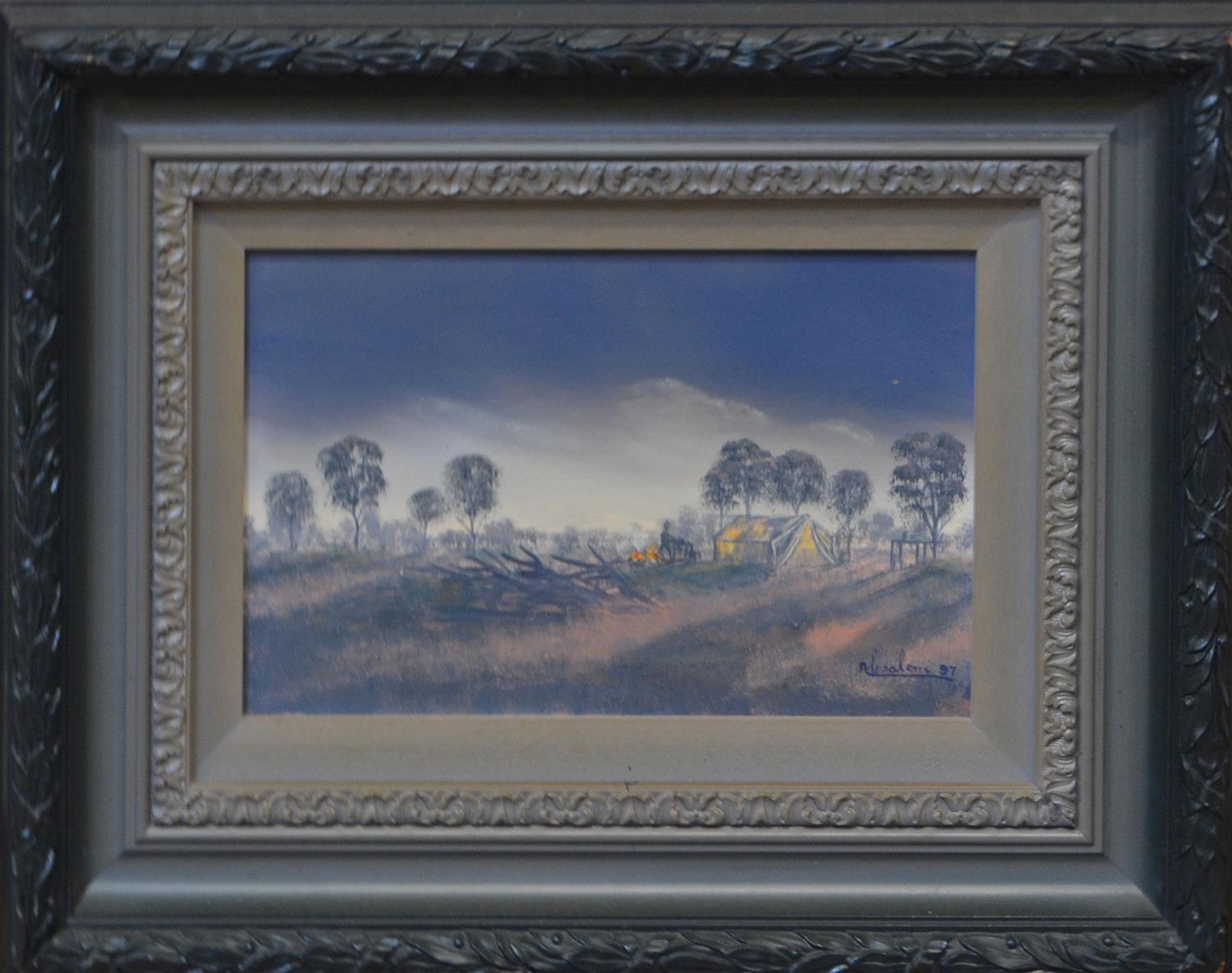 JACK ABSALOM, OUTBACK CAMP, OIL ON BOARD, 19 X 30CM, FRAME SIZE: 41 X 51CM, CONDITION: MINOR SCRATCHES