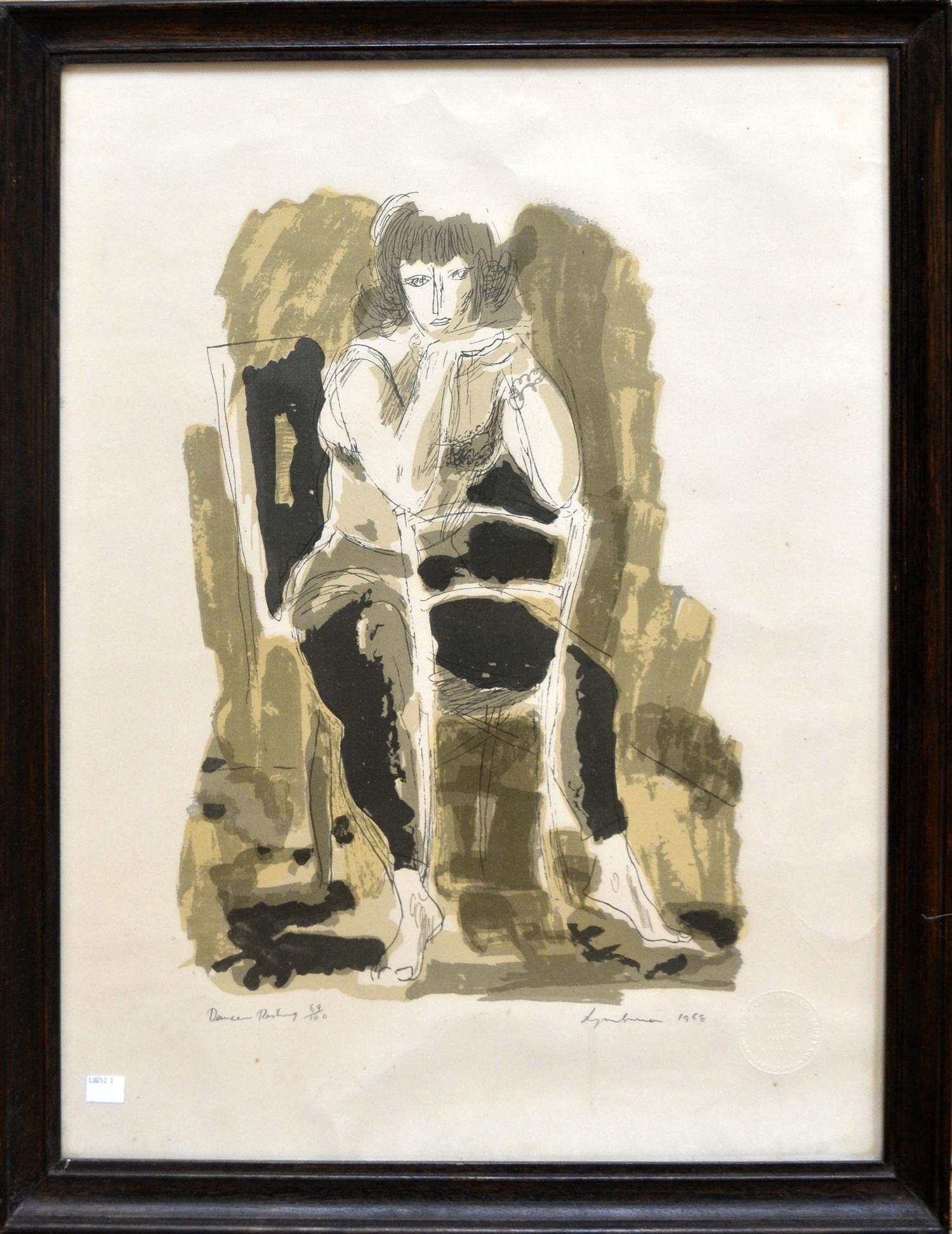 FRANCES LYMBURNER, DANCER RESTING 1968, LITHOGRAPH 69/100, 60 X 34CM, FRAME: 76 X 58CM, CONDITION: DISCOLOURATION AND LIGHT FOXING SPOTS SEEN, HANDLING MARKS TO EDGES, LEONARD JOEL DELIVERY SIZE: MEDIUM