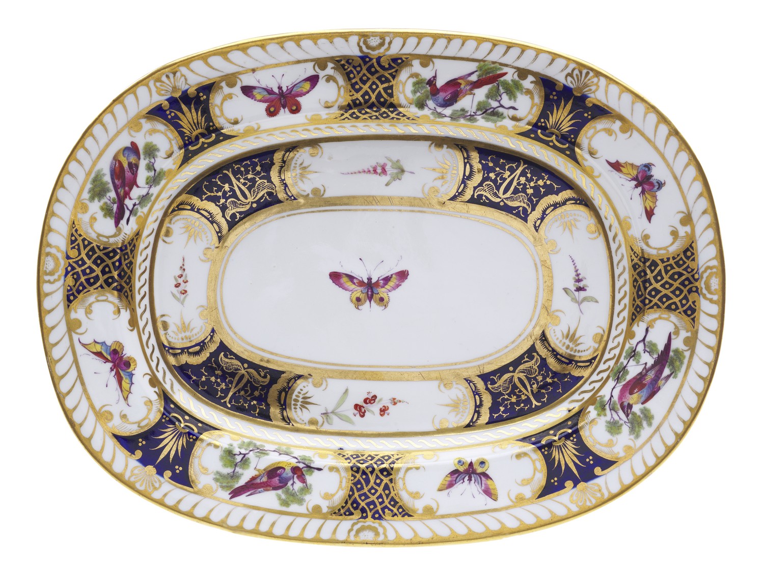Of oval form, with gilded borders with blue ground with alternating reserves decorated with butterflies and birds. No marks to reverse.
