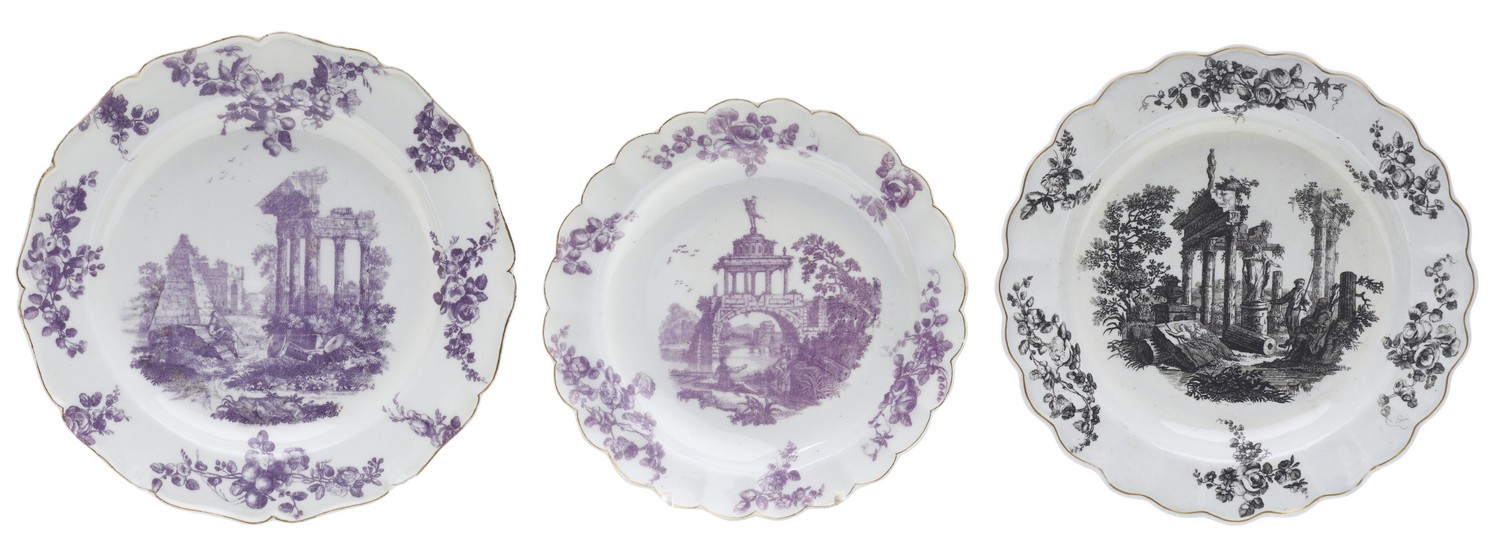 Each with a lobed edge, decorated with varying classical ruin scenes.