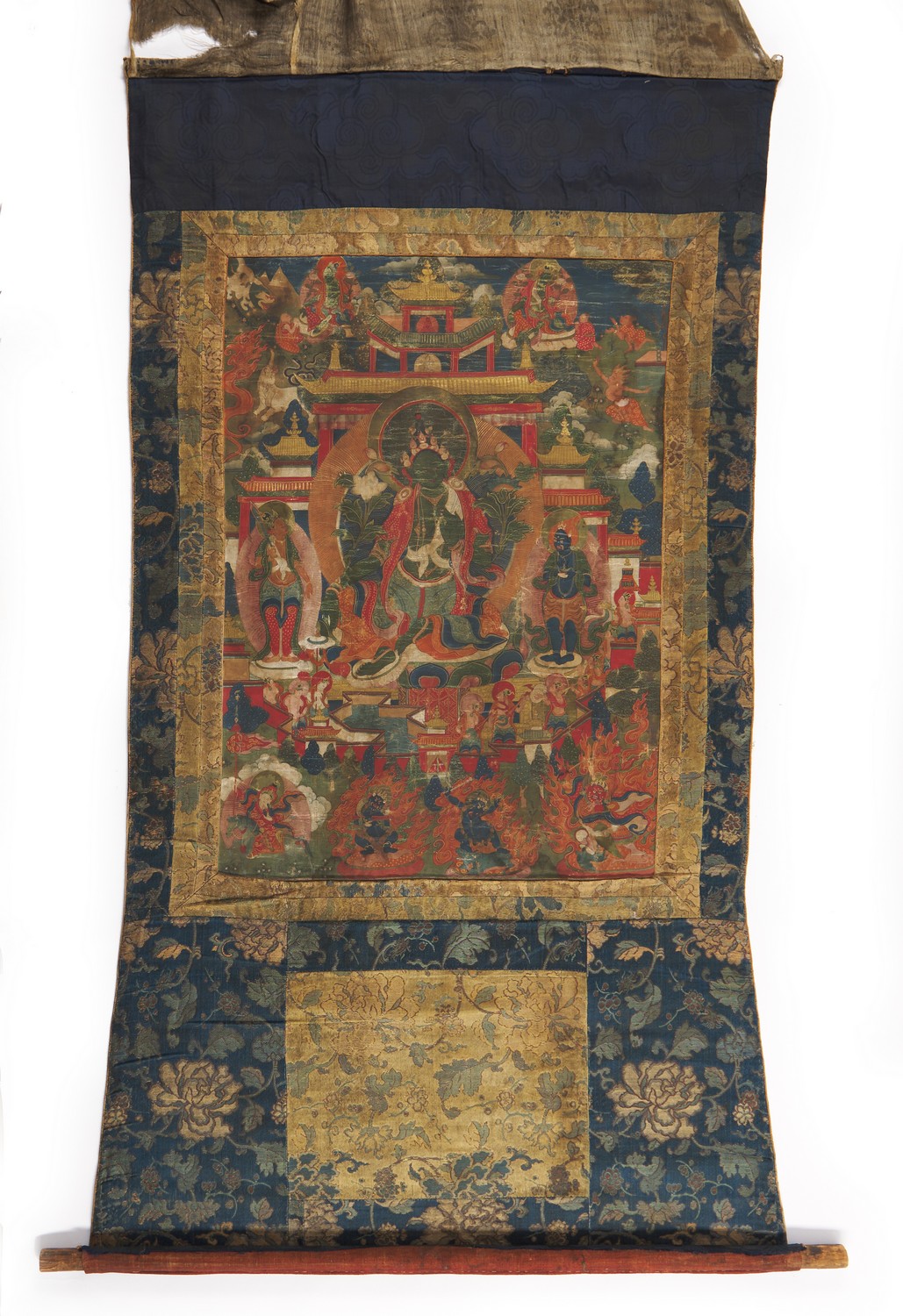 Depicted with green skin seated in rajalalithasana on a lotus throne, surrounded by palaces and deities, in a brocade silk mount.
