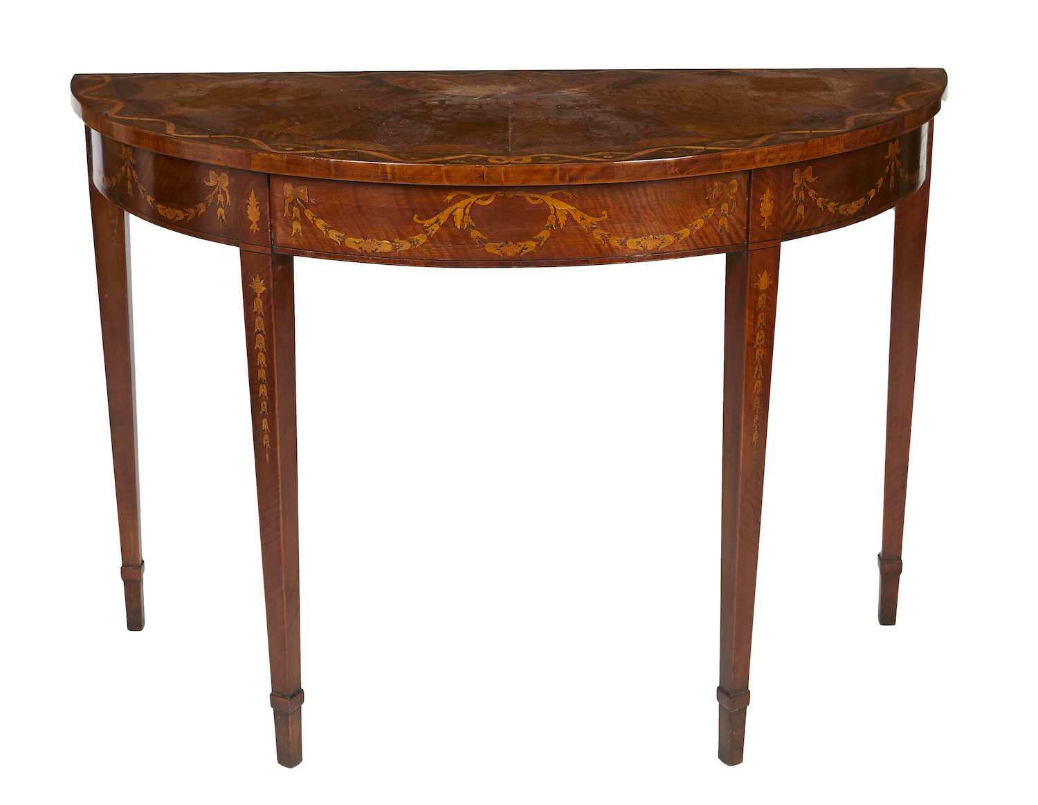 In high neoclassical taste, the top with a crossbanded border in hairwood, inlaid with satinwood and mahogany in ribbon, acanthus and floral motifs. The central panel inlaid with a large, elaborate anthemion motif surrounded by bold hairwood acanthus leaves, framed by a large fan-shaped panel in a satinwood and mahogany veneered whorl pattern with very fine stringing. The deep apron inlaid with garland and ribbon inked motifs above four elegant square, tapered and banded legs. Brass plaque for 'S & H Jewell', fine antique dealers London, to base.