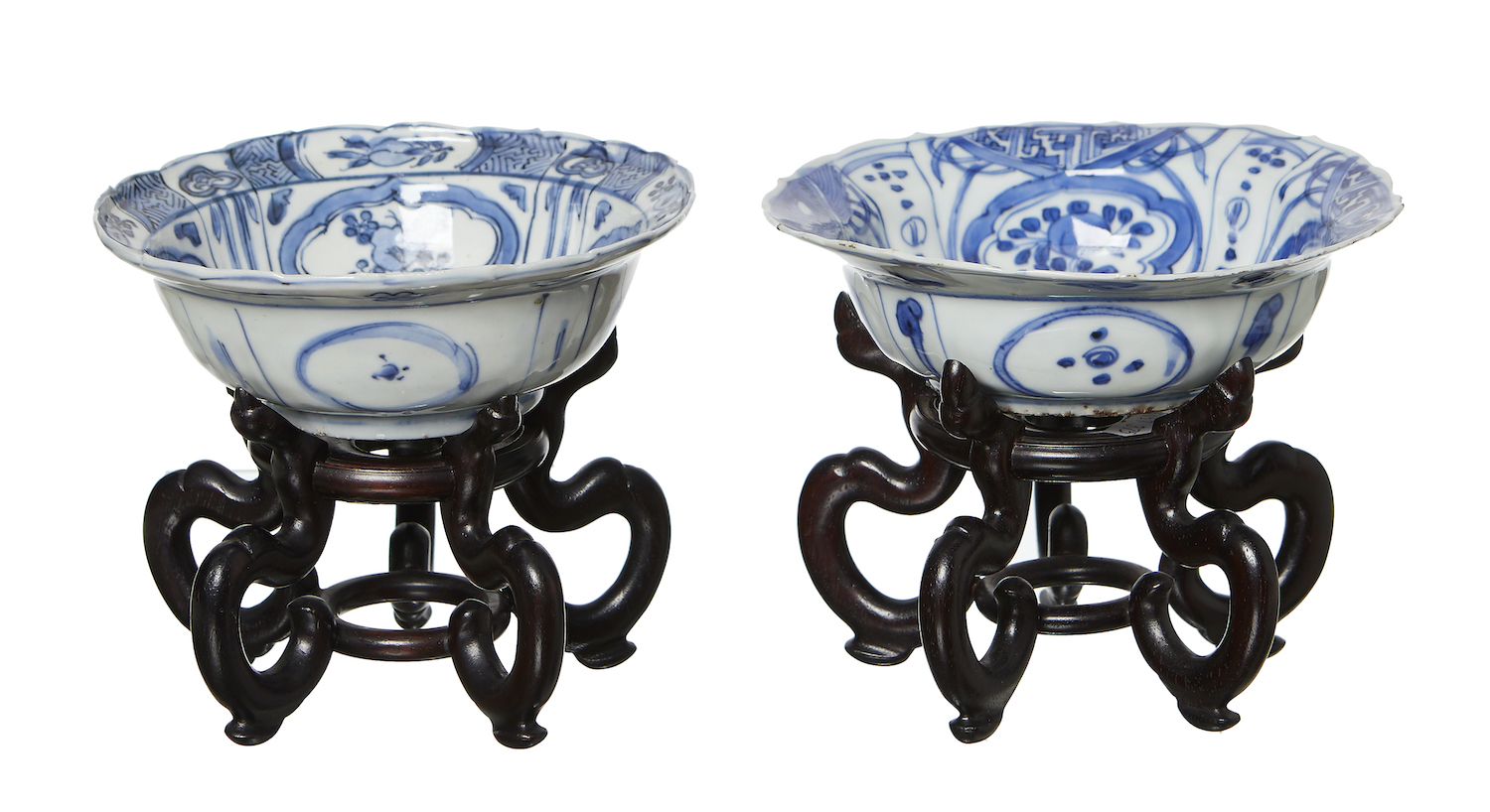 In very good condition. The underside base of each bowl has spitting within the glaze, one bowl has minor glaze-shrinkage and discolouration around the base-rim. This same bowl has very minor roughness and discolouration to some points of the upper rim. Stands are in fine order.