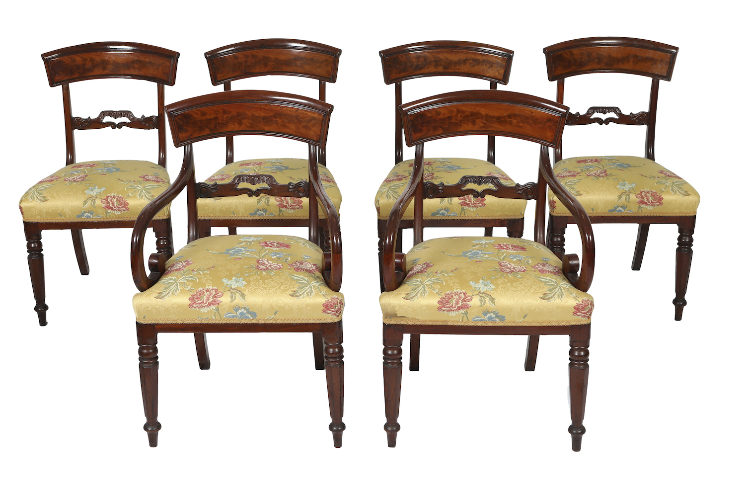 The set comprised of four single chairs and two carvers with scrolled arms, the frames with deeply faceted front legs and sabre shaped rear legs, pierced and acanthus carved seat rails and generous spade shaped top rails with flame veneered panels. The stuffed seats upholstered in a fine quality floral jacquared.