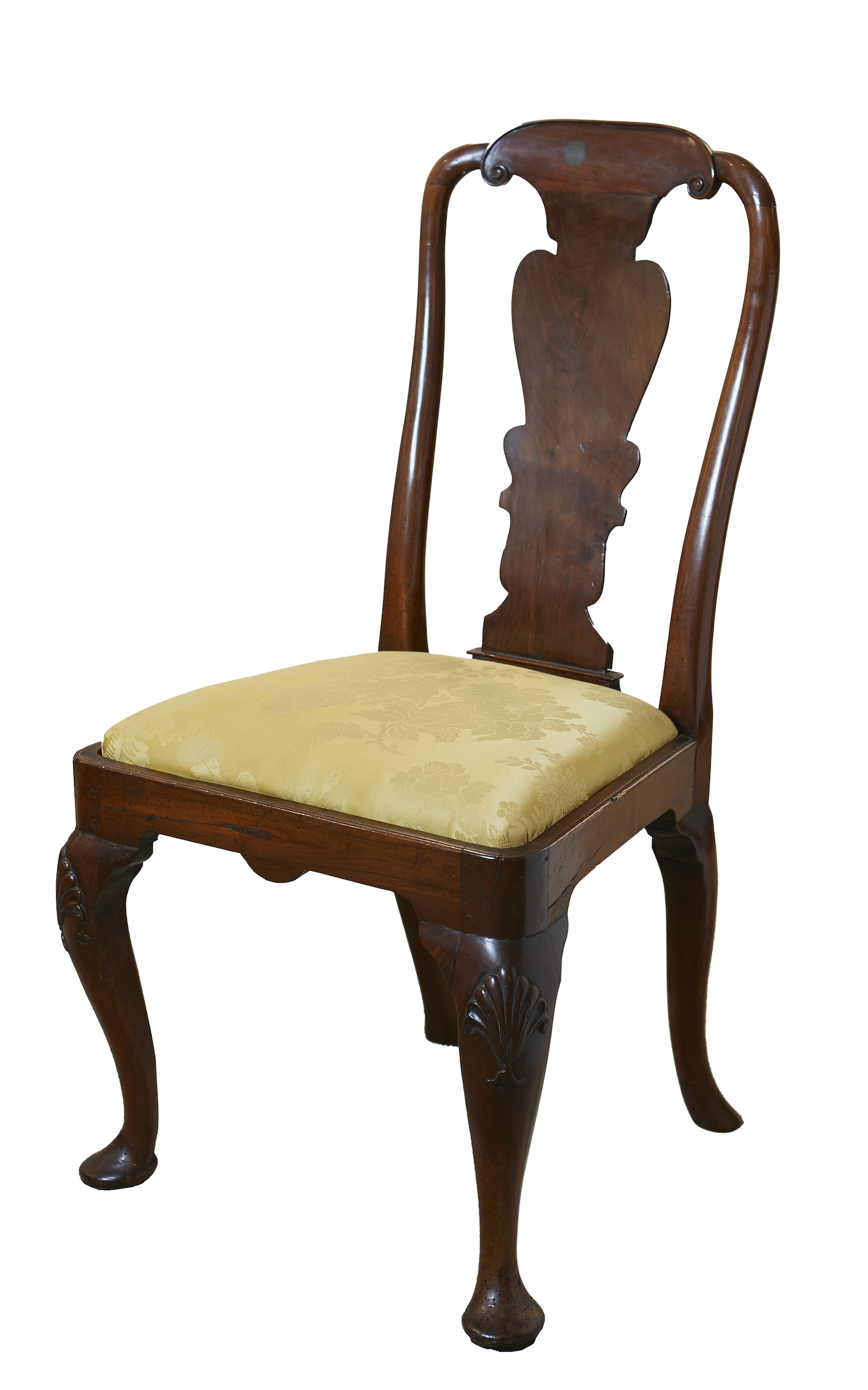 The frame in solid walnut, of pegged construction, with a drop-in silk covered stuffed seat. The gently cabriole shaped legs with bold shell carved knees and generous pad feet typical of the period. The back with a C-scroll top rail, above a vase shaped solid splat. 'British Antique Dealers Association' stamp to back rail.