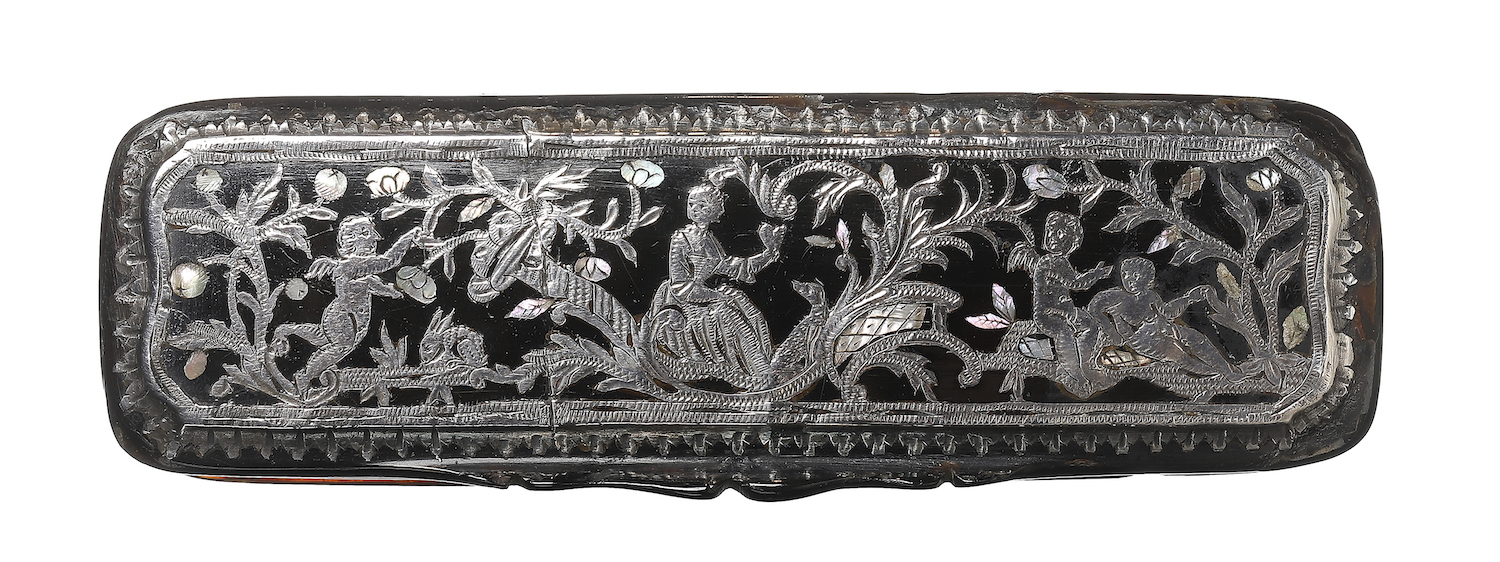 The rectangular lid with silver and mother of pearl decoration of classical figures in a landscape.