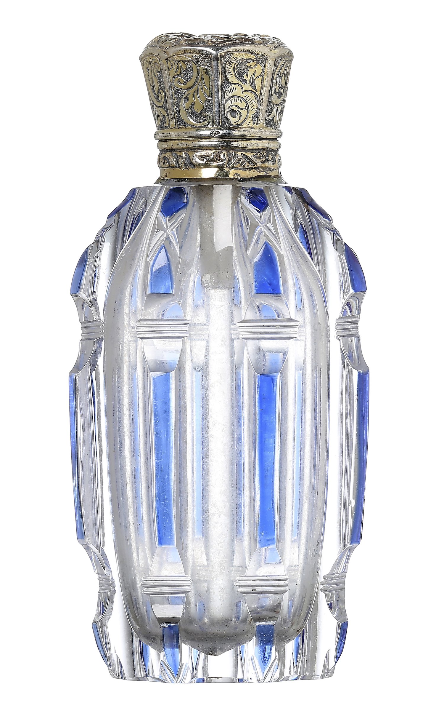 A BLUE OVERLAID GLASS SCENT BOTTLE WITH SILVER GILT MOUNTS
