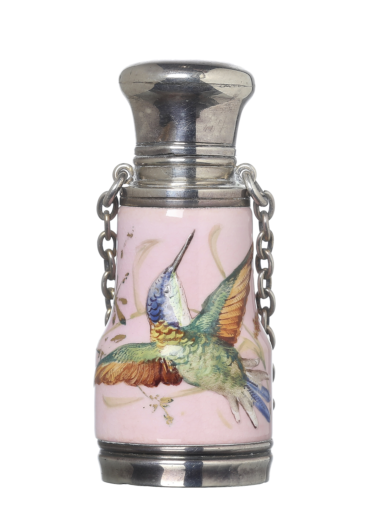 The pink enameled body decorated with a kingfisher and butterfly. A silver hinged lid, the silver mounted base inset with a mirror.