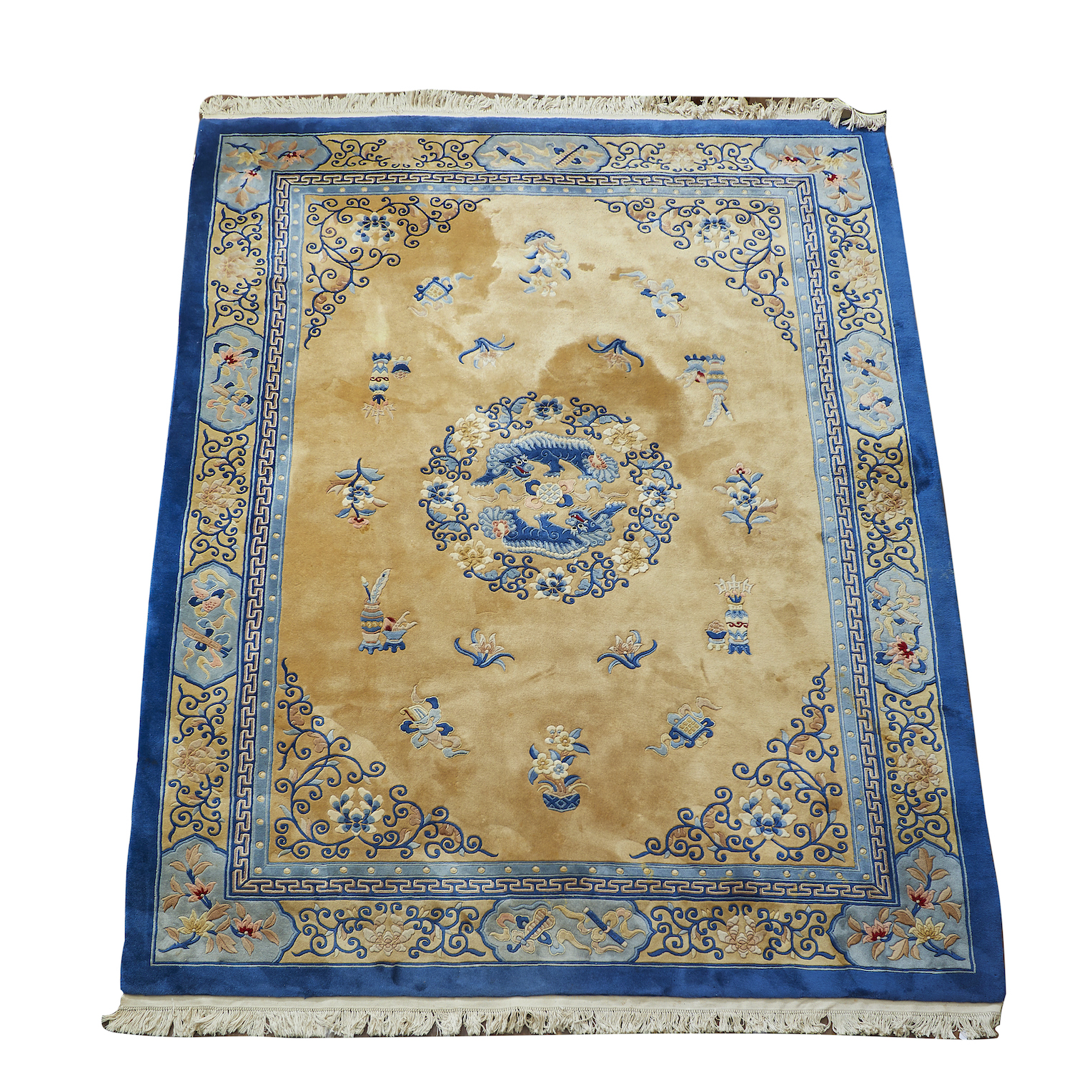Of large scale, in fine open pile woolwork, predominantly woven in blues on a pale gold background. Decorated with a central medallion of two dragons surrounded by vases, flowers and folliage, and a strong border including an eternity motif.