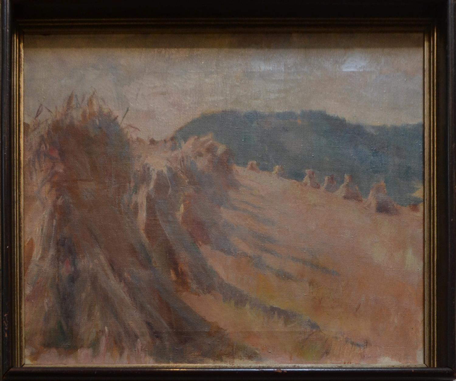 AUSTRALIAN SCHOOL, HAYSTACKS C.1920, OIL ON CANVAS, IMAGE SIZE: 40 X 47CM, FRAME SIZE: 45 X 52CM, CONDITION: GOOD CONDITION, SLIGHT PAINT LOSS ON CENTRE RIGHT, ORIGINAL FRAME WITH SCUFFS AND MARKS AS WITH AGE