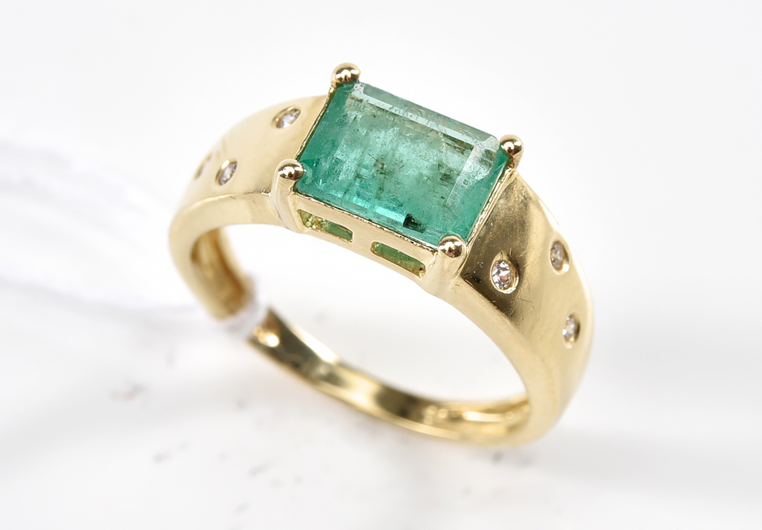 AN EMERALD AND DIAMOND RING IN 14CT GOLD, SIZE N, 3GMS
