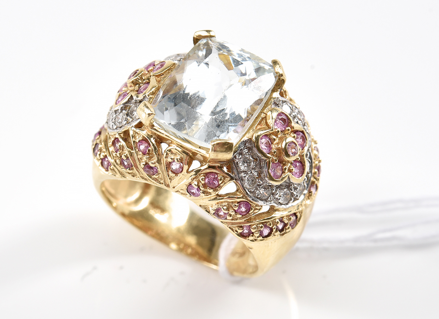 AN AQUAMARINE, DIAMOND AND PINK SAPPHIRE RING IN 14CT GOLD, SIZE L