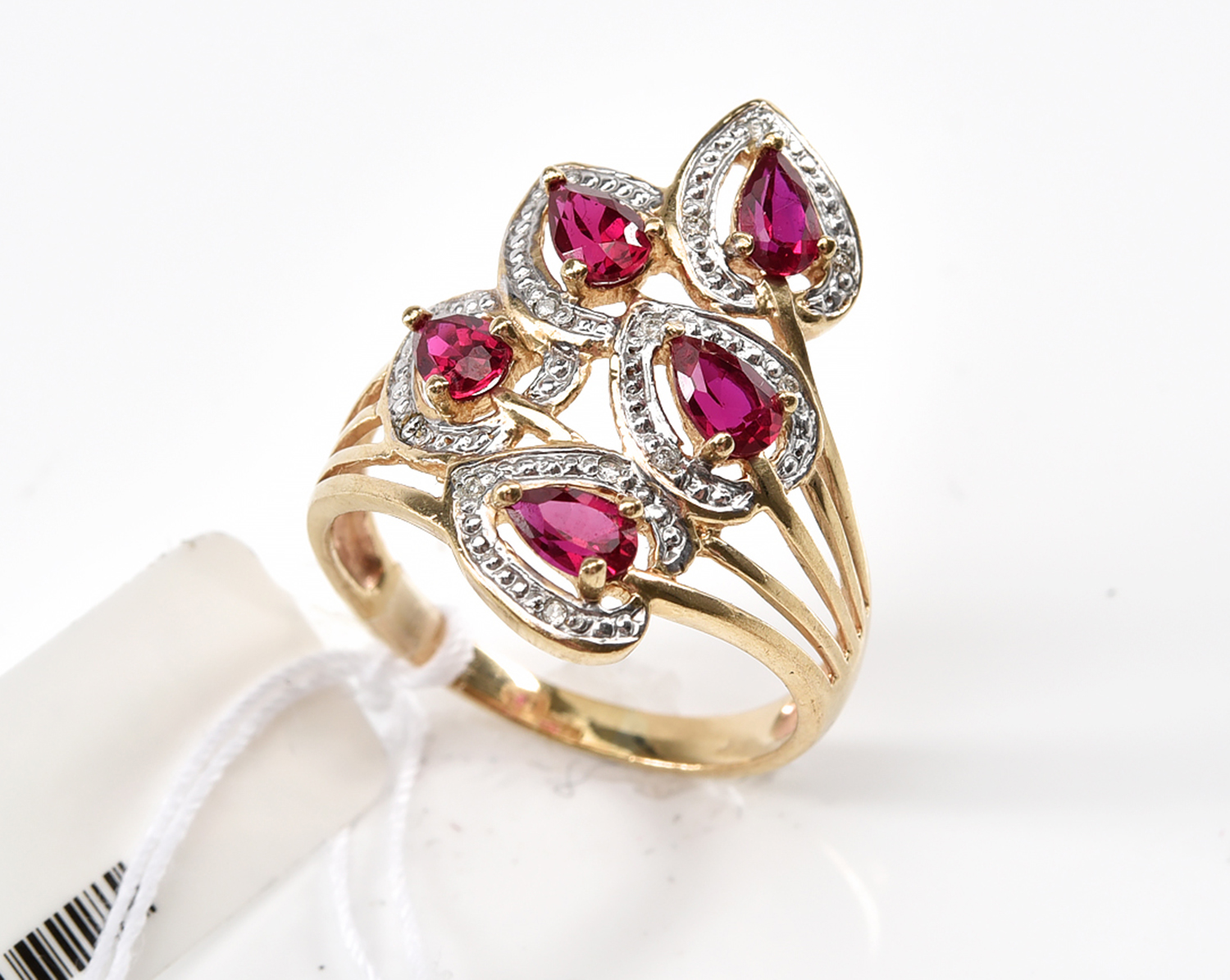 A SYNTHETIC RUBY DRESS RING IN 9CT GOLD, SIZE P, 3.7GMS