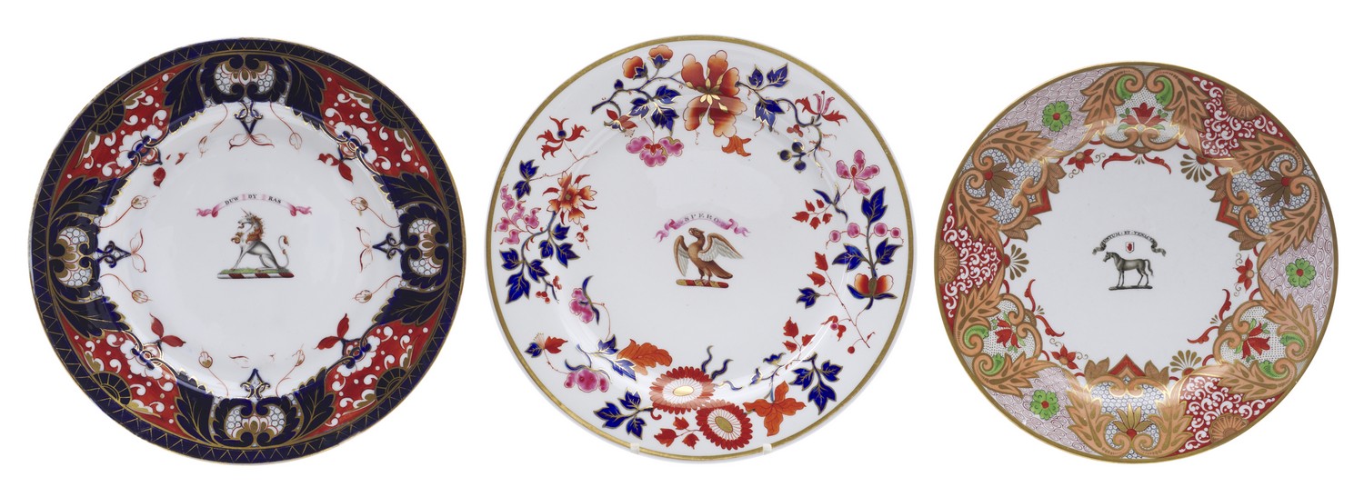 The first, decorated with acanthus scrolls in the Imari palette, the centre with a horse crest painted en grisaille below the motto 'Justum Et Tenacem' for Sir Nicholas Colthurst, 4th baronet, of Ardrum, County Cork, Ireland. Flight Barr & Barr factory mark to reverse (circa 1810), together with a Leonard Joel paper label for the Payne Collection. The second, decorated with acanthus scrolls in the Imari palette, the centre painted with a unicorn crest below the motto 'Duw Dy Ras' for the Kemeys Tynte family of Glamorgan, Wales. Chamberlain's Worcester factory mark to reverse, circa 1825. The third, decorated with scrolling flowers, in iron red and blue, the centre painted with an eagle crest below the motto 'Spero'. Impressed Flight Barr & Barr factory mark to reverse.