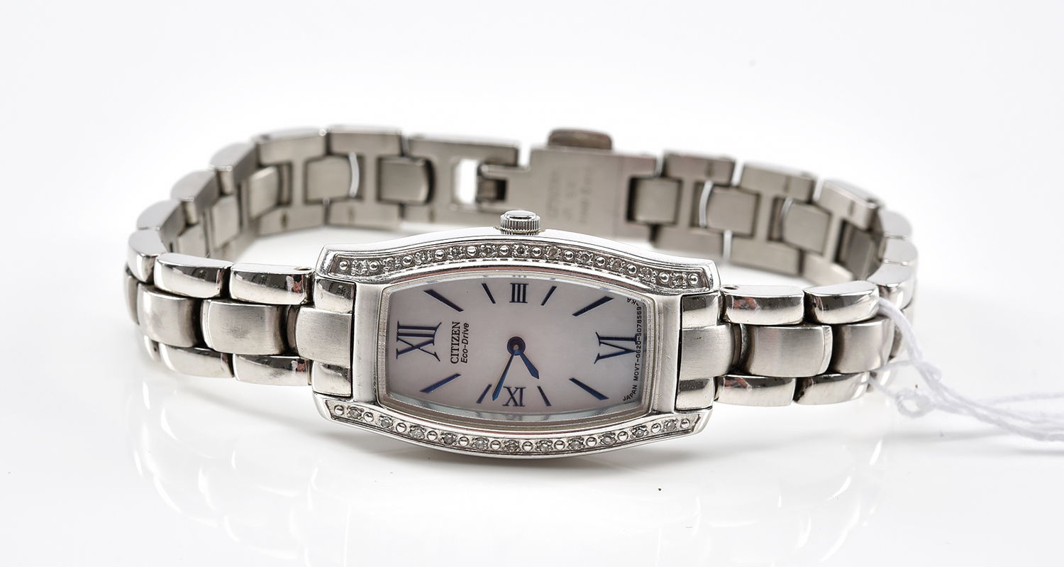 A LADIES CITIZEN ECO DRIVE QUARTZ WRISTWATCH WITH MOTHER OF PEARL DIAL AND DIAMOND BEZEL, IN STAINLESS STEEL, BOXED