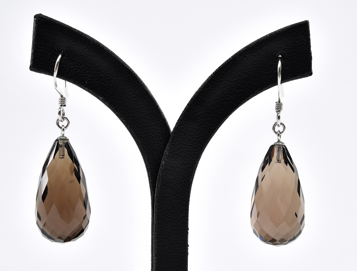 A PAIR OF BRIOLETTE CUT SMOKEY QUARTZ EARRINGS TO STERLING SILVER SHEPHERD HOOK FITTINGS