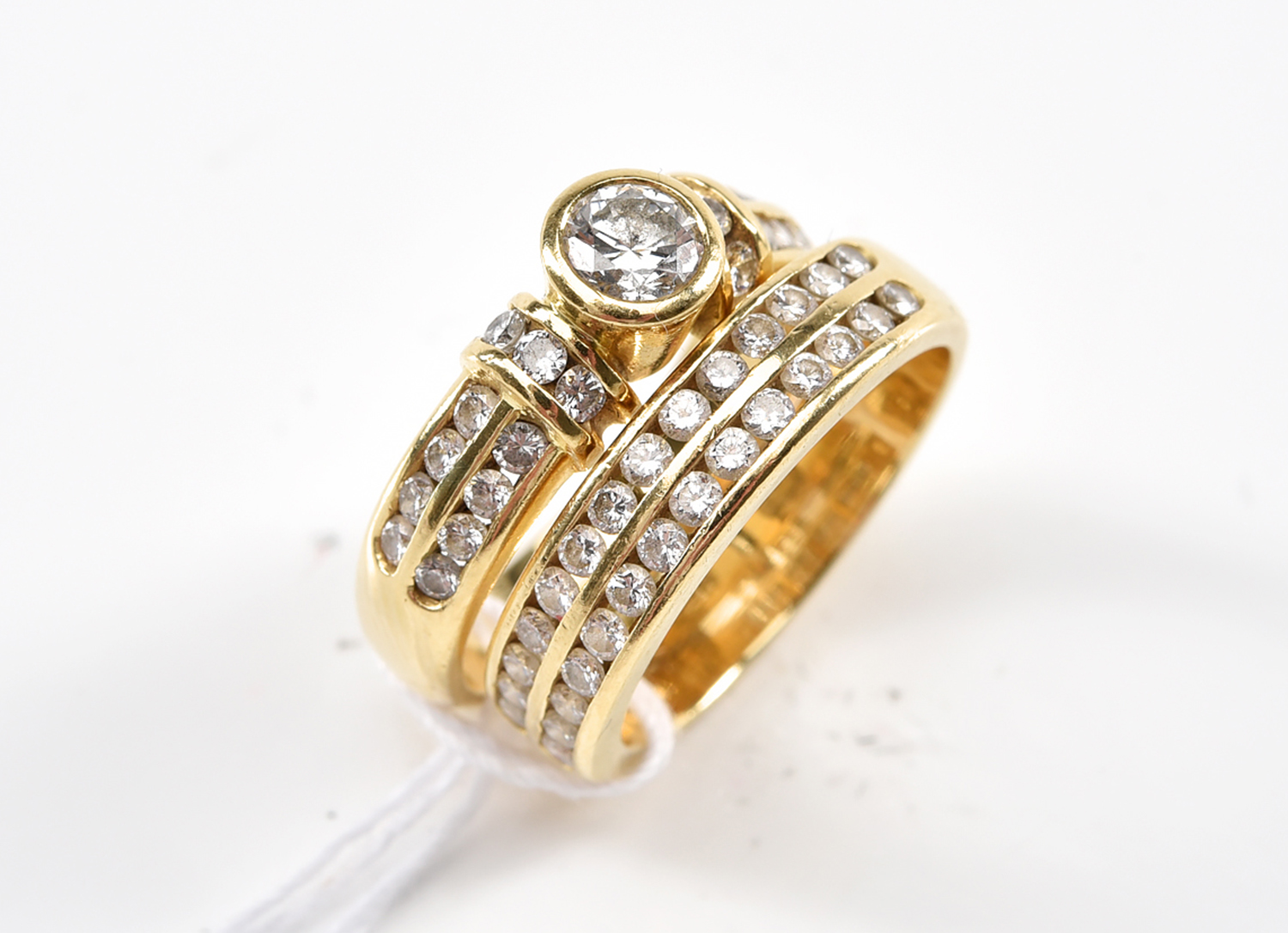 A THREE STONE DIAMOND RING - Comprising three round brilliant cut diamonds in 18ct rose gold, ring size R.