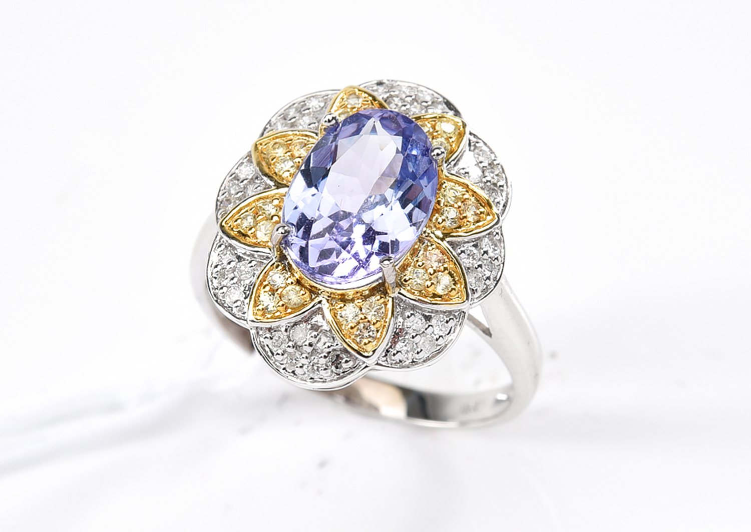 A TANZANITE AND DIAMOND DRESS RING IN 18CT GOLD, SIZE N