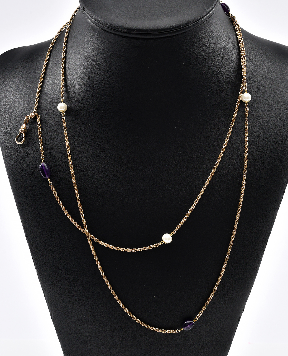 A VINTAGE GUARD CHAIN SET WITH AMETHYST AND SEED PEARLS, GOLD LINED